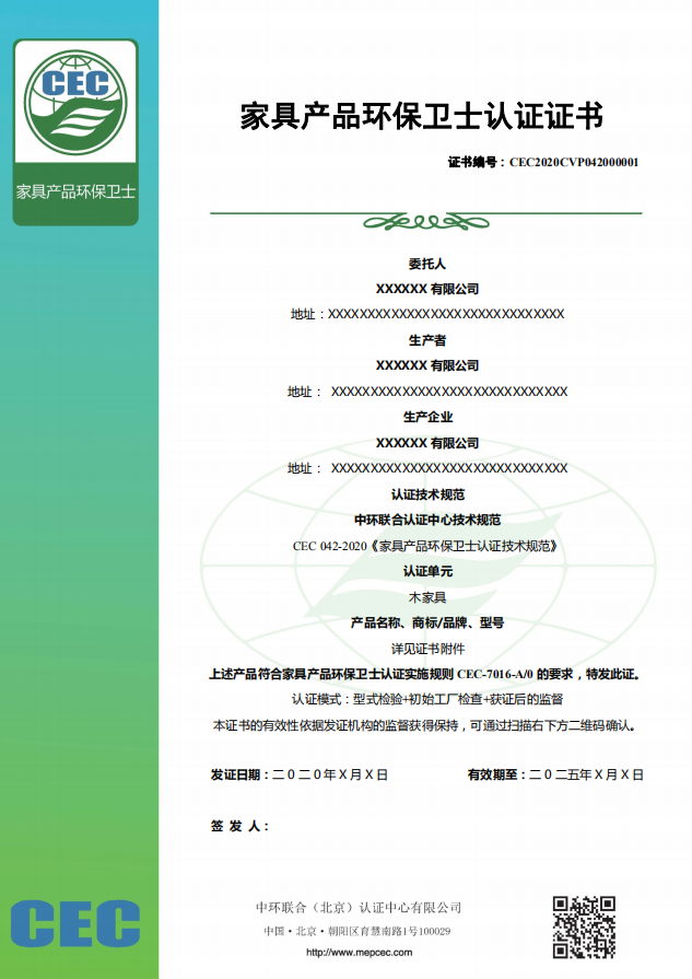 “家具產(chǎn)品環(huán)保衛(wèi)士”認(rèn)證證書由中環(huán)聯(lián)合(北京)認(rèn)證中心(以下簡稱CEC)設(shè)計開發(fā)的“其他自愿性工業(yè)產(chǎn)品”認(rèn)證,認(rèn)證規(guī)則編號CEC7016-A0,依據(jù)標(biāo)準(zhǔn)編號: CTS CEC042-2020并由中國國家認(rèn)證認(rèn)可監(jiān)督管理委員會批準(zhǔn)備案,可在全國認(rèn)證認(rèn)可信息公共服務(wù)平臺查詢