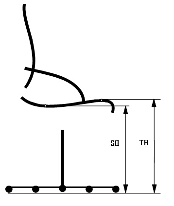 當座椅承受64kg的載荷時,座面高(圖4,SH)范圍應(yīng)在400mm~515mm之間。座面前緣高(圖4,TH)應(yīng)在420~530之間。