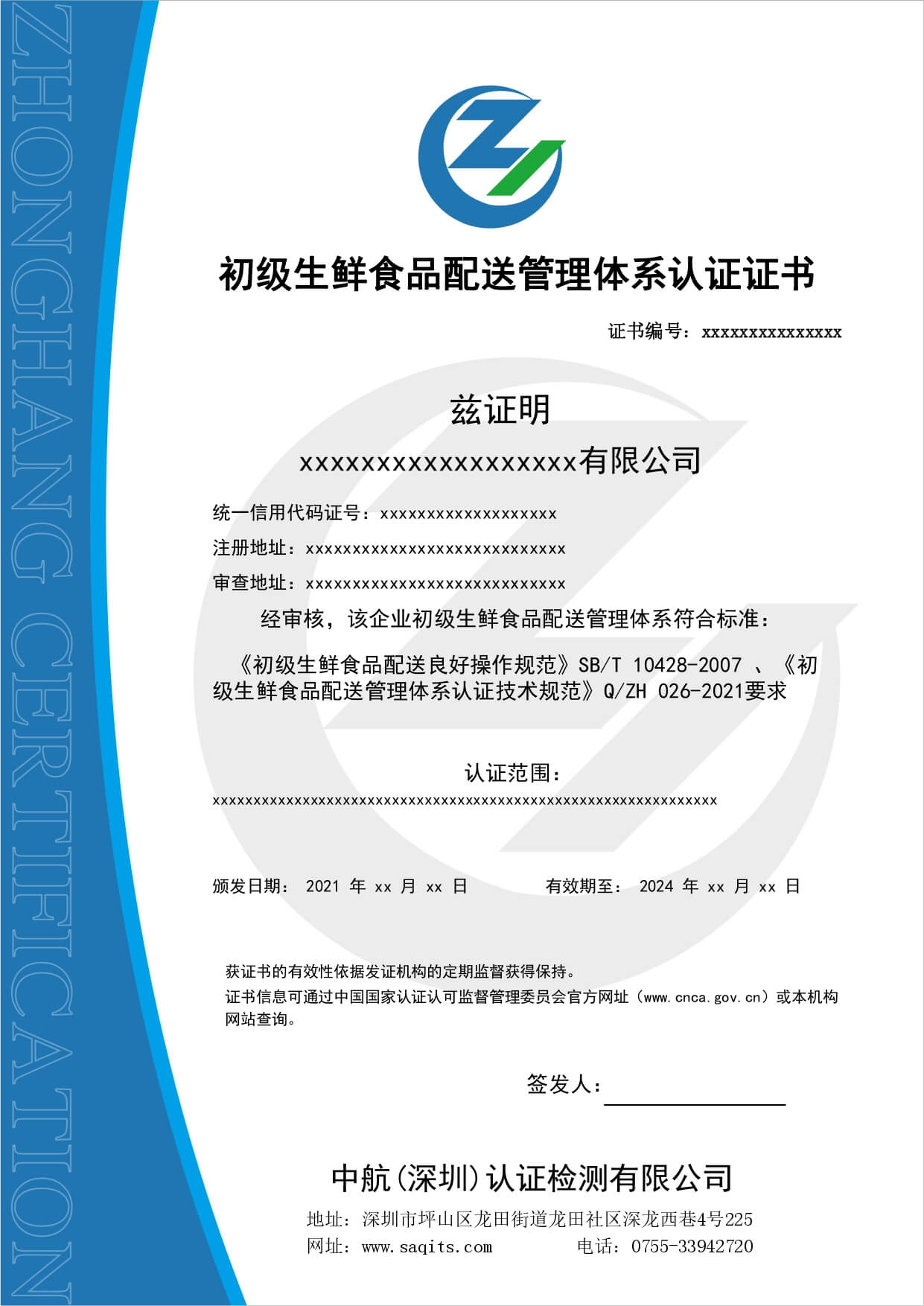 生鮮食品配送服務認證證書:1.保證生鮮食品以較短時間、較少流通環(huán)節(jié)進入消費環(huán)節(jié);2.保證生鮮食品在流通中實現(xiàn)品質的穩(wěn)定或提升; ...查看更多>>