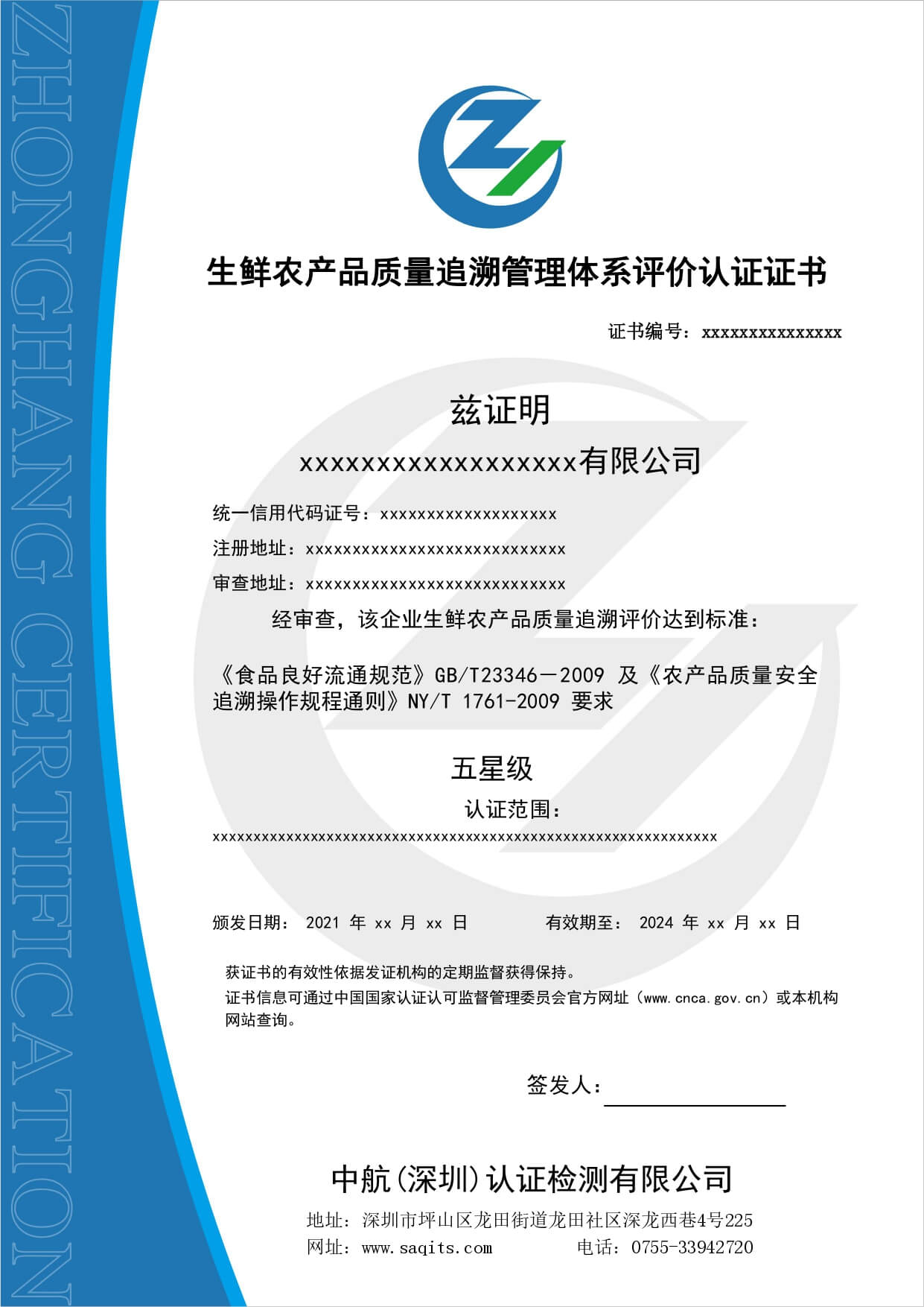 • 生鮮農(nóng)產(chǎn)品質量追溯管理體系評價認證證書