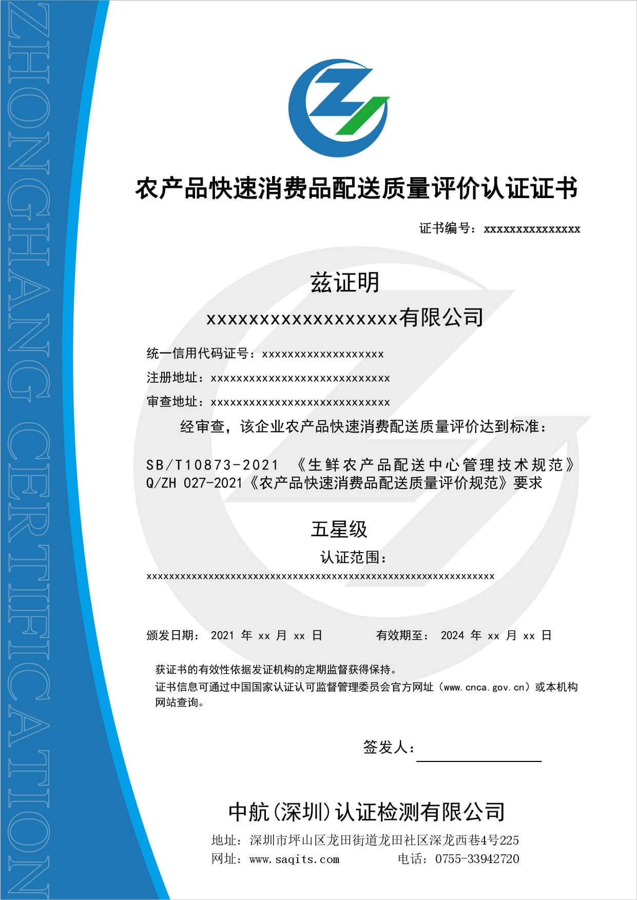 • 農(nóng)產(chǎn)品快速消費品配送質量評價認證證書