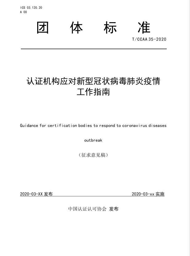 呼之欲出的《認(rèn)證機(jī)構(gòu)應(yīng)對新型冠狀病毒肺炎疫情工作指南》的團(tuán)體標(biāo)準(zhǔn),即將出來。里面詳細(xì)的規(guī)定了“疫情防控期間認(rèn)證機(jī)構(gòu)運(yùn)行管理和疫情防控期間認(rèn)證審核的策劃與安排”。詳見以下附件: